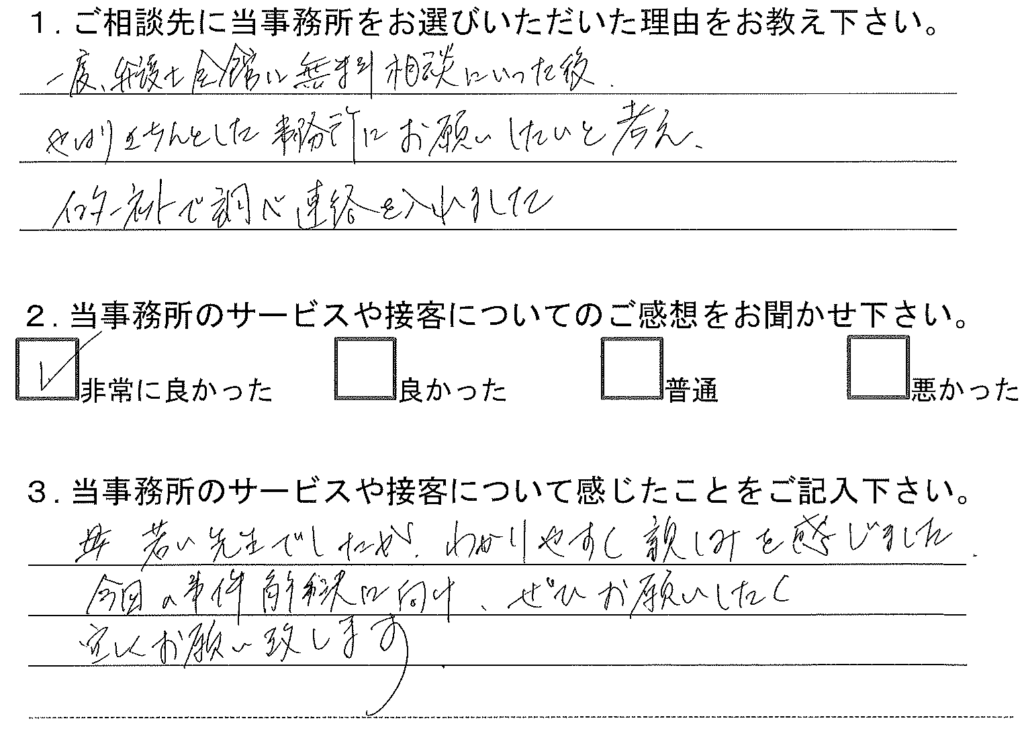 若い先生でしたが、わかりやすく親しみを感じました。今回の事件解決に向け、ぜひお願いしたく宜しくお願い致します。